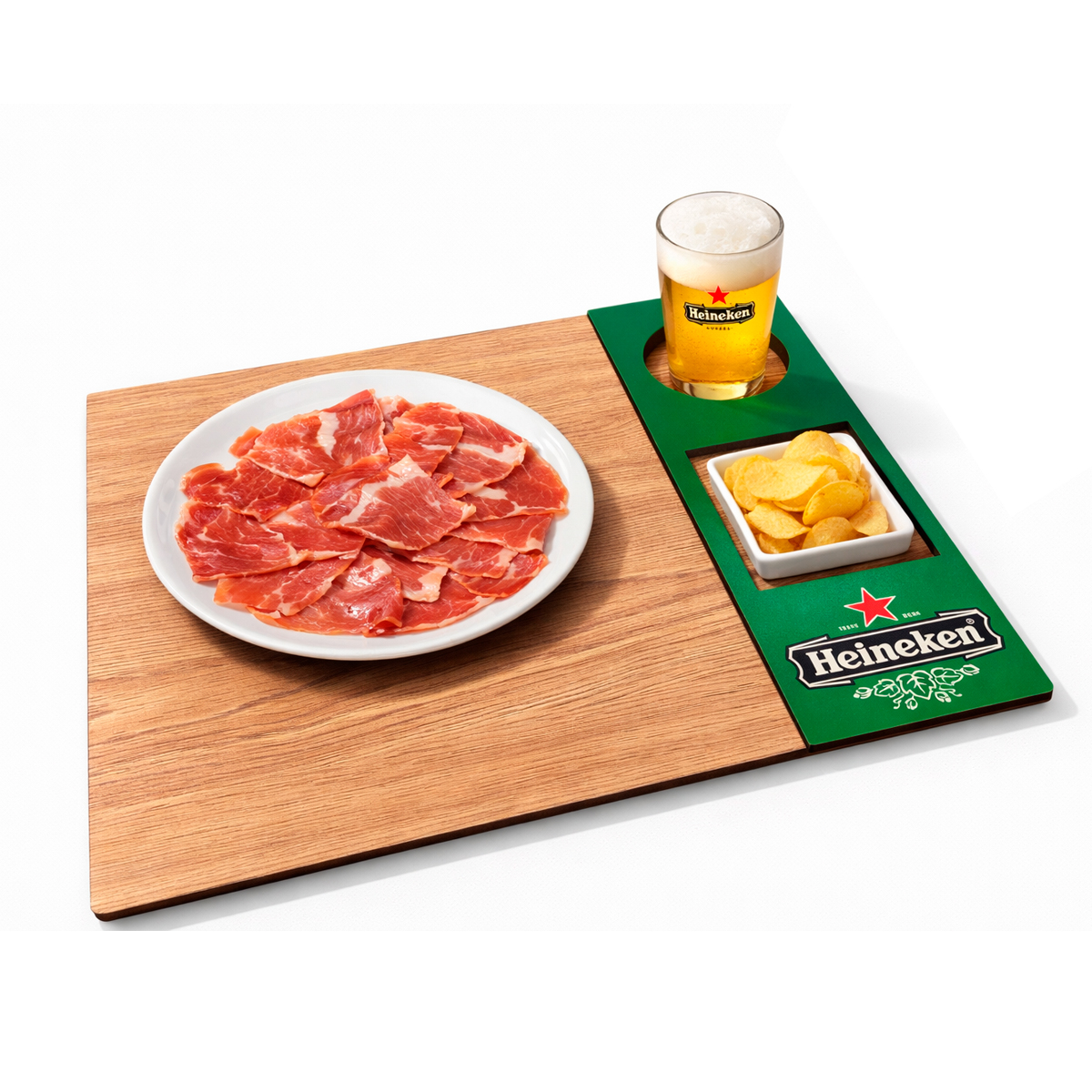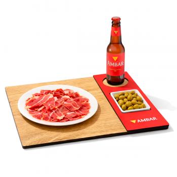 Original soporte de madera diseñado para hostelería, ideal para presentar de forma práctica y atractiva una consumición acompañada de tapa o aperitivo. Combina una base amplia para plato con una zona lateral personalizada que incorpora alojamiento para vaso o botella y un hueco para cuenco o snack. Su diseño mejora la presentación en mesa, optimiza el espacio y refuerza la imagen de marca gracias a la posibilidad de personalización con colores, logotipos o acabados corporativos. Una solución funcional y diferenciadora para