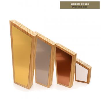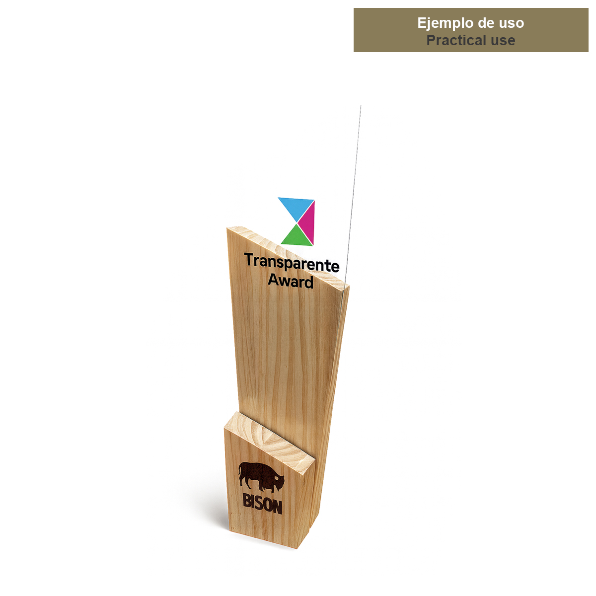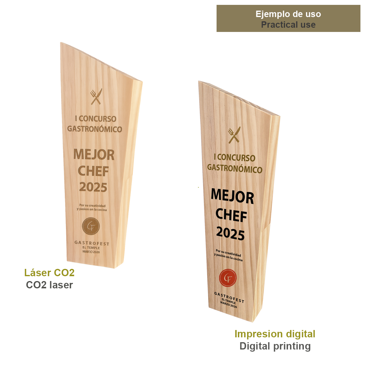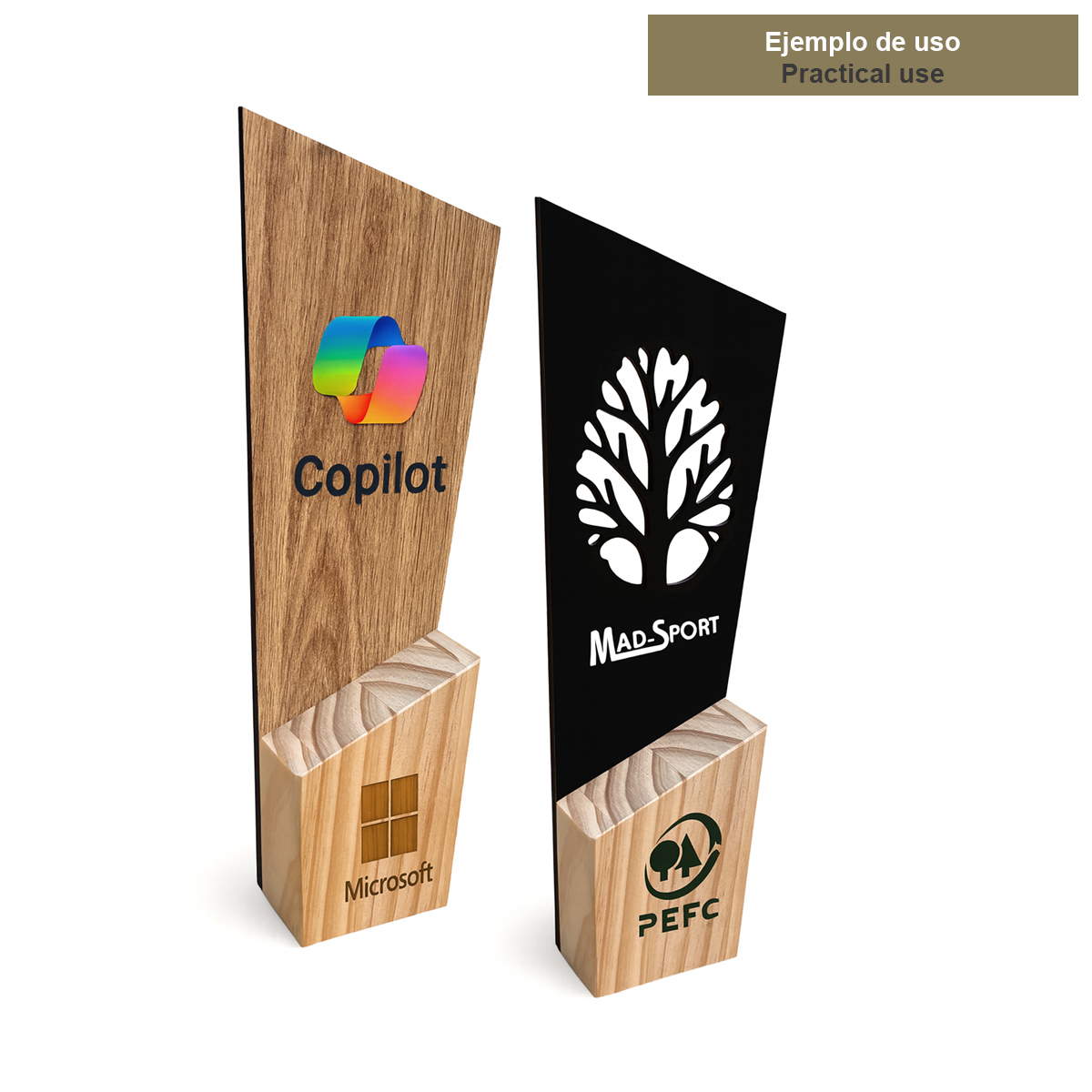 Gracias a sus amplias superficies frontales y laterales, permite una personalización muy visible y elegante: marcado láser directo sobre la madera, impresión a color o combinación con placa (metalizada o grabada) según el estilo del evento. Un trofeo sobrio, premium y muy versátil, perfecto para diseños minimalistas o para destacar logotipos, nombres y mensajes con impacto.